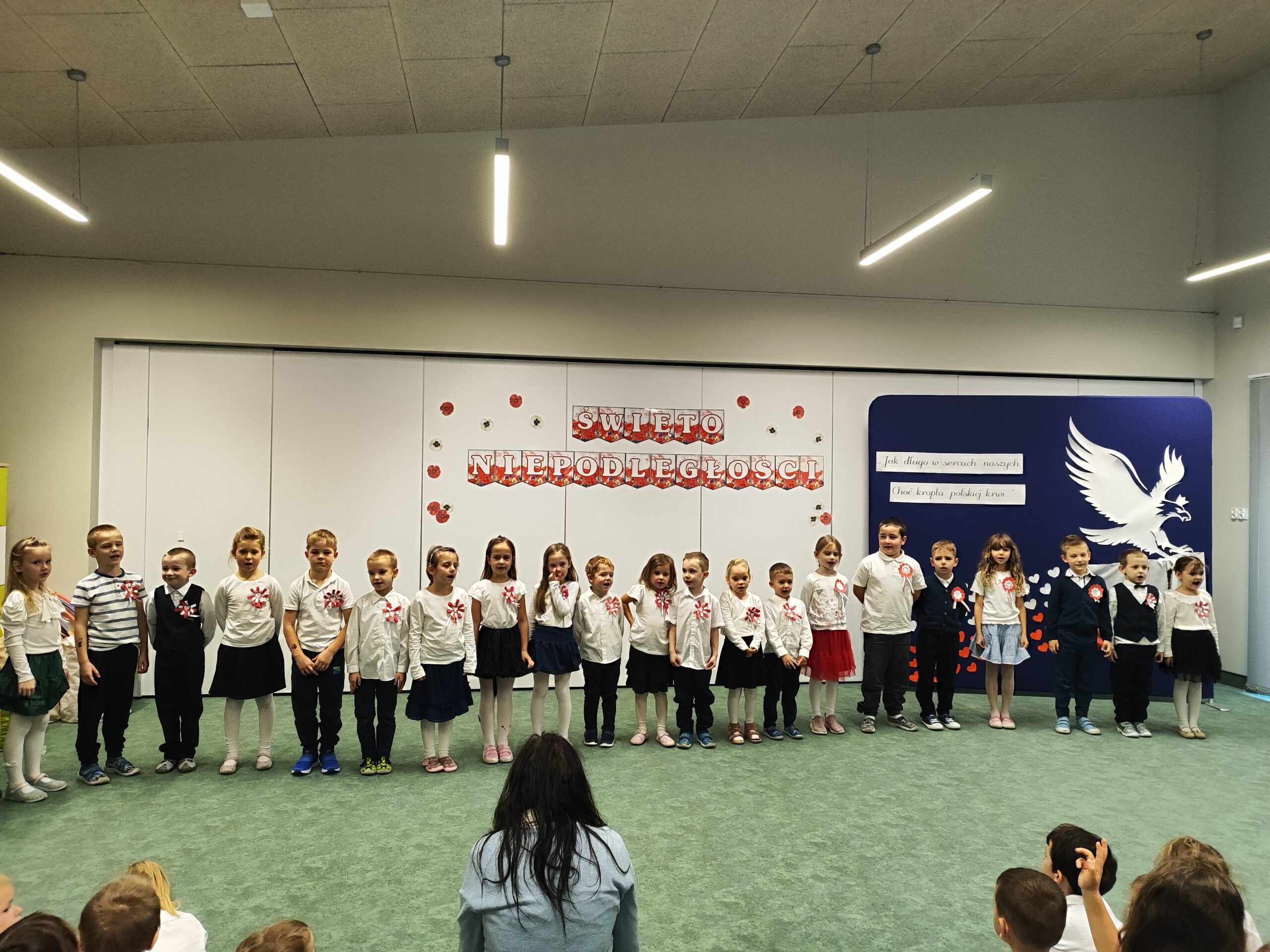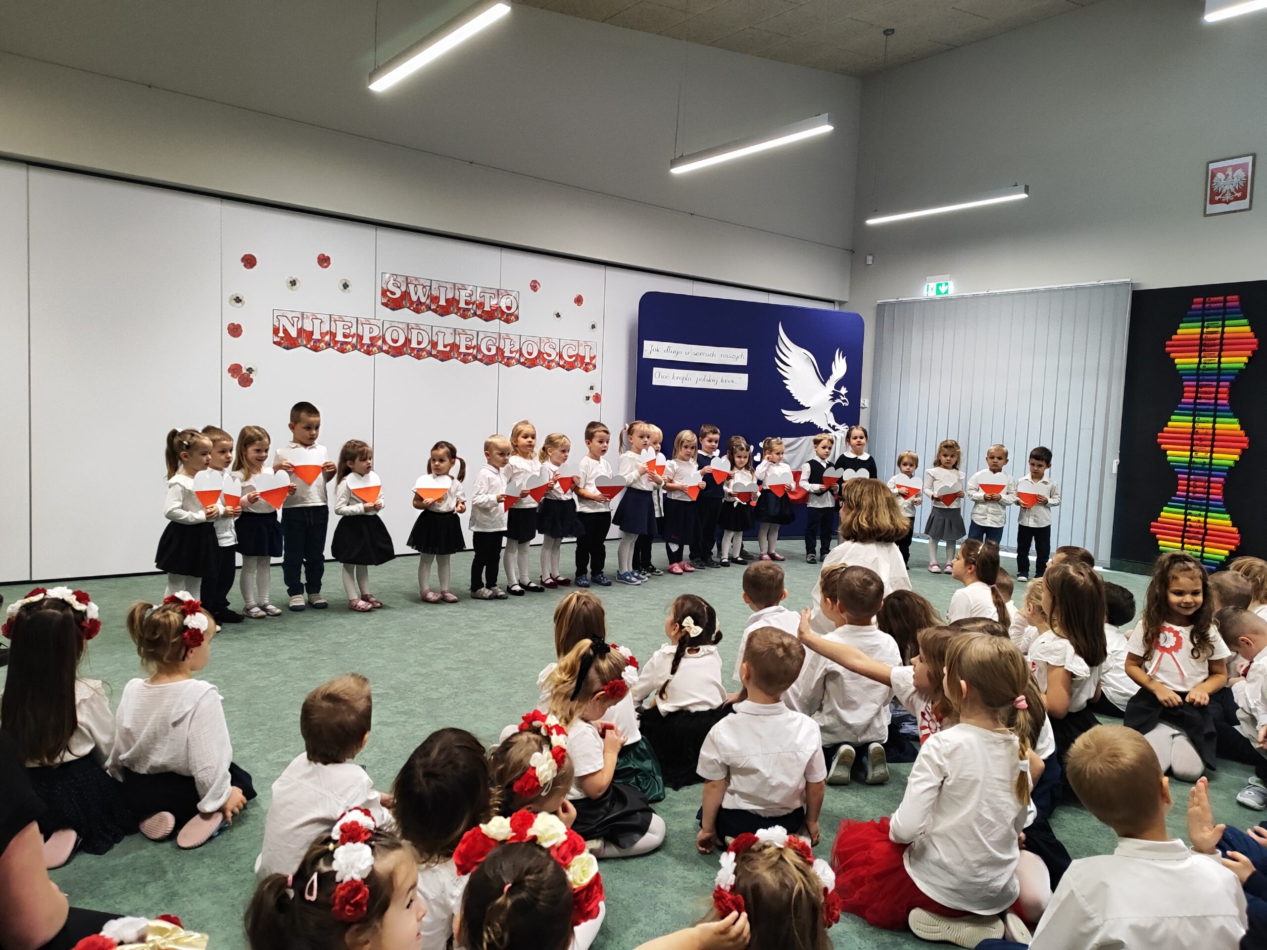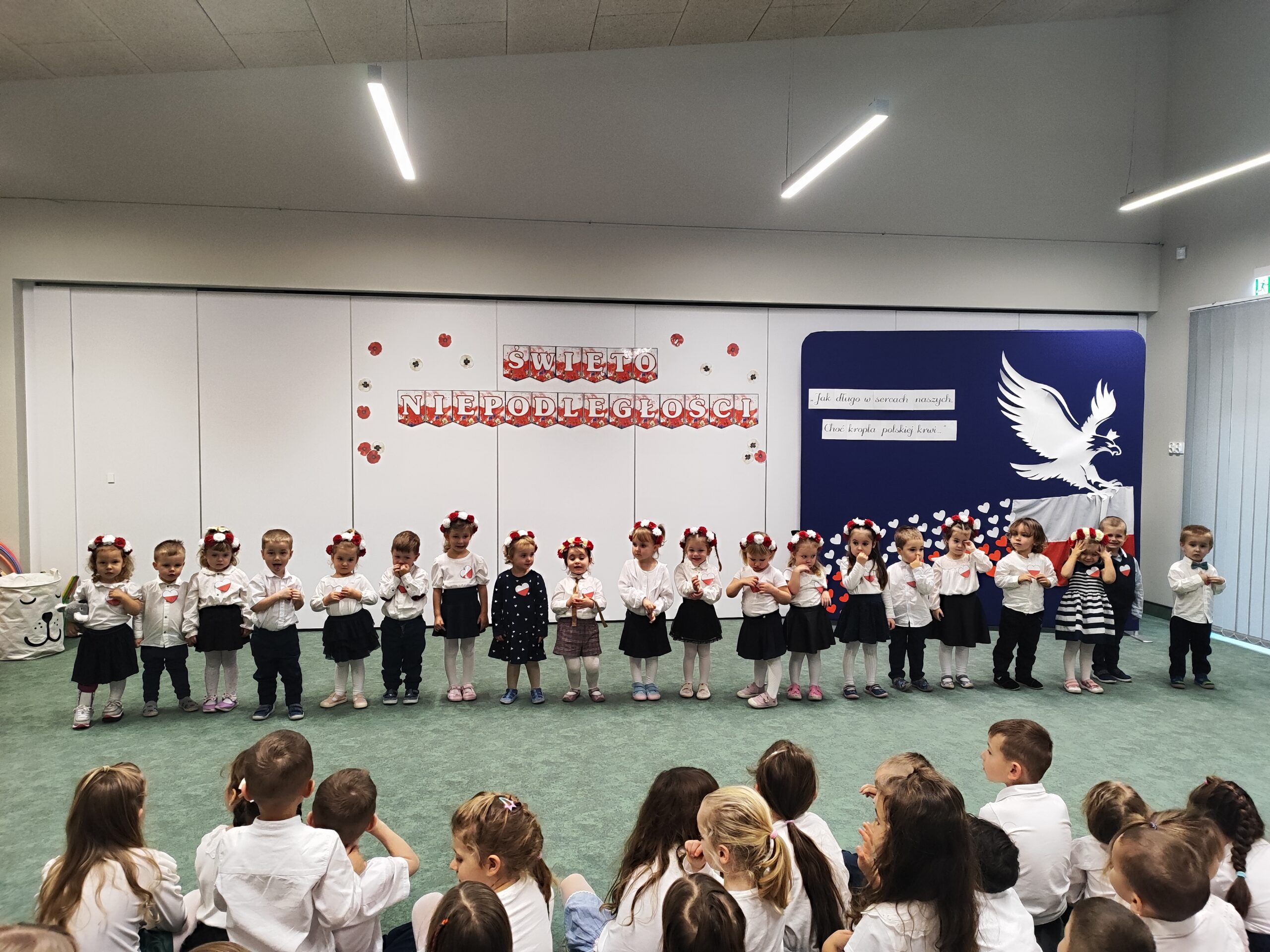 Po wspólnym odśpiewaniu hymnu każda z grup zaprezentowała przygotowaną część artystyczną. Dzieci z wielkim zaangażowaniem śpiewały piosenki o Polsce oraz recytowały patriotyczne wiersze, pokazując radość i dumę z udziału w świętowaniu. Występy te były nie tylko pięknym przeżyciem, lecz także ważnym elementem kształtowania poczucia tożsamości narodowej oraz rozwijania postaw pełnych szacunku i miłości do ojczyzny.