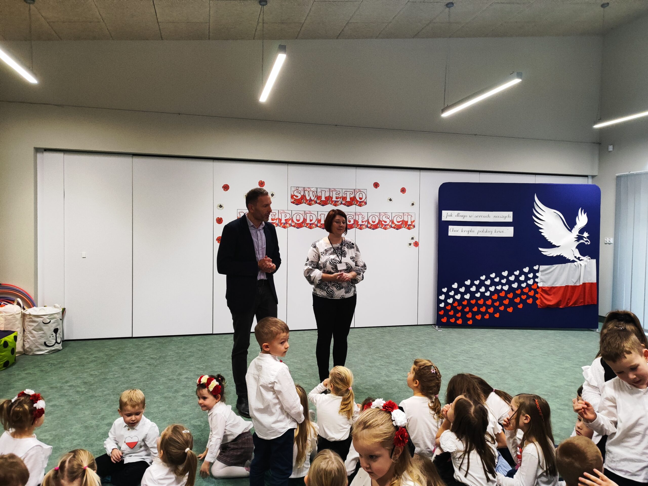 12 listopada w naszym przedszkolu odbyła się uroczysta akademia z okazji Święta Niepodległości. Tego dnia wszystkie przedszkolaki zgromadziły się w jednej sali, aby we wspólnej, odświętnej atmosferze odśpiewać hymn Polski. Był to wyjątkowy moment sprzyjający budzeniu szacunku, miłości i przywiązania do naszego kraju.