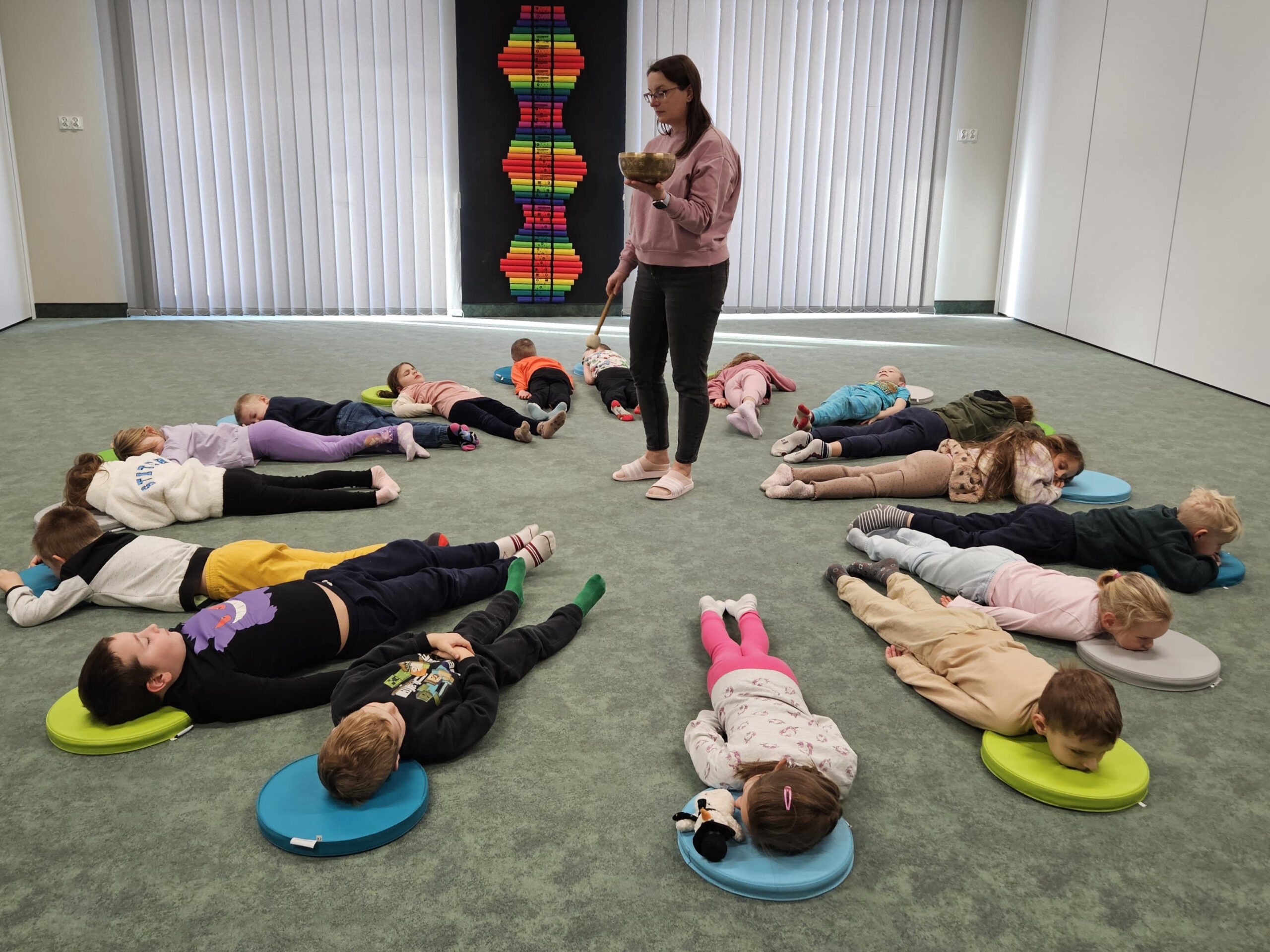 W naszym przedszkolu misa tybetańska jest używana podczas zajęć wyciszających w różnych grupach wiekowych. Dodatkowym elementem wspierającym relaksację są tutaj poduszki zakupione w ramach Gminnego Programu Profilaktyki i Rozwiązywania Problemów Alkoholowych oraz Przeciwdziałania Narkomanii.