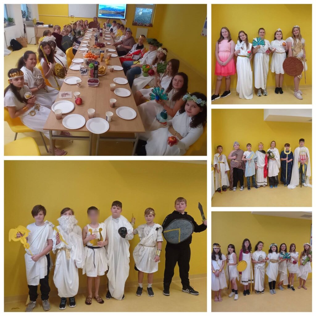 Nasi piątoklasiści przenieśli się prosto na Olimp! 🏛✨Wszyscy uczniowie zaprezentowali się w przepięknych, starannie przygotowanych strojach bogów i bogiń greckich, a sala zamieniła się w prawdziwą ucztę mitologicznych bohaterów.