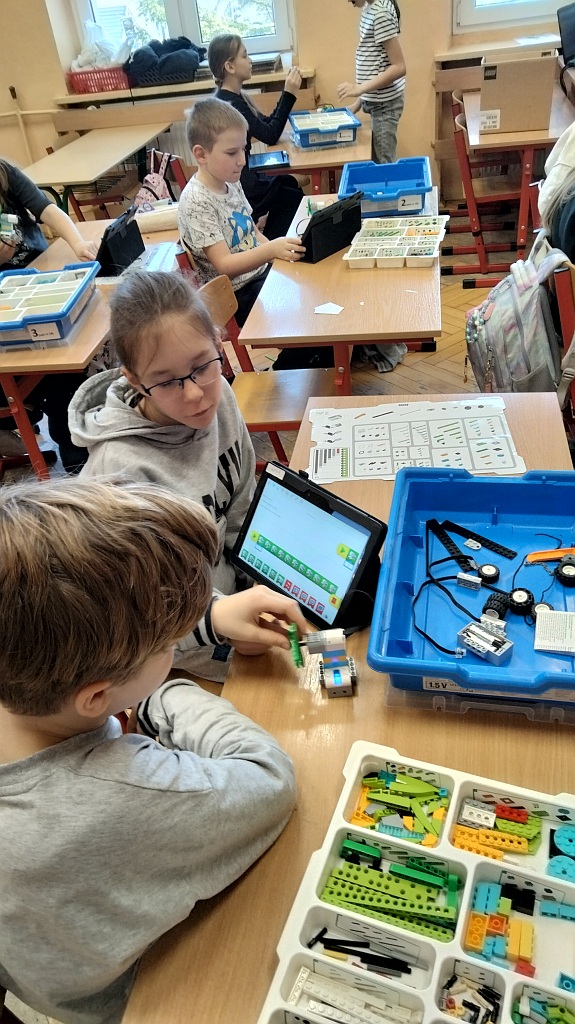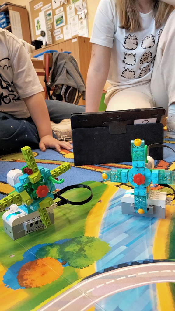 W II półroczu roku szkolnego 2023/2024 uczniowie klas trzecich realizowali na zajęciach programowania wyzwania konstrukcyjne z wykorzystaniem Klocków Lego WeDo 2.0. Dzieci budowały wskazane roboty oraz samodzielnie wprawiały je w ruch układając sekwencje ruchów w aplikacji. Niewątpliwie najciekawszym czasem dla dzieci z realizacji zajęć były wyzwania twórcze. Uczniowie bazując na zdobytych wiadomościach oraz podstawowych założeniach konstrukcyjnych budowały własne roboty. Inspiracją do twórczych konstrukcji stały się zagadnienia bloków tematycznych edukacji wczesnoszkolnej omawianych w maju i czerwcu m.in.: „Transport drogowy i powietrzny”. Na zajęciach programowaliśmy różnego typu samochody rajdowe, wózki, śmieciarki a także śmigłowce. Pojawiły się również propozycje tematów edukacji przyrodniczej. Uczniowie poprzez udział w zajęciach rozwijali wiele umiejętności, nie tylko w zakresie programowania. Pracowaliśmy nad umiejętnościami rozwiązywania problemów, ćwiczyliśmy skupienie uwagi, pracowaliśmy nad motywacją do pracy oraz rozbudzaliśmy chęć poznawania świata. Dzieci rozwijały wyobraźnię przestrzenną, utrwalały wiedzę matematyczną i techniczną oraz uczyły się planowania i przewidywania działań własnych.