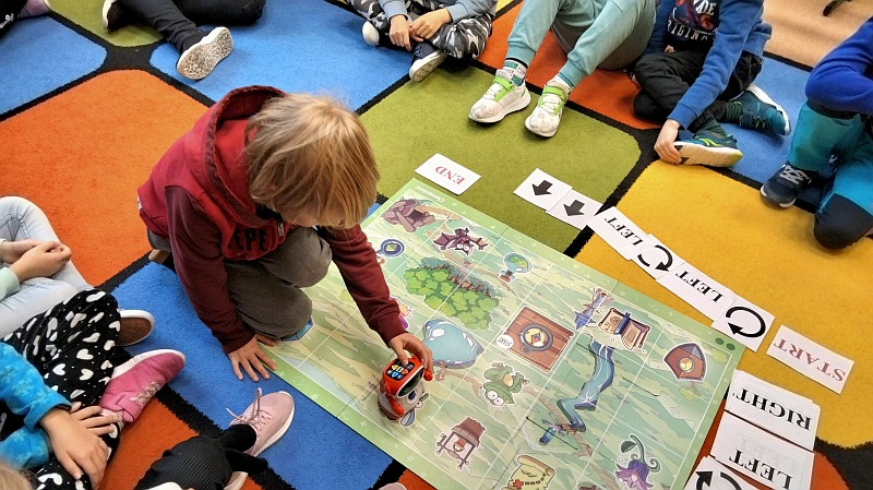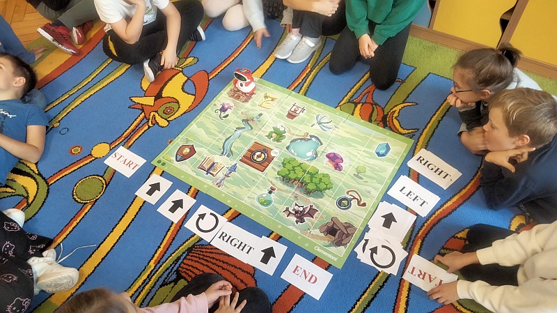 Uczniowie z dużym zaangażowaniem pracują w oparciu o tematykę i program roczny w którym zawarte są treści dotyczące kształtowania i rozwijania umiejętności w zakresie kodowania i programowania. W I semestrze roku szkolnego uczniowie pracowali na macie edukacyjnej z kolorowymi kubeczkami i kafelkami. Ćwiczenia miały na celu rozwijanie zainteresowań związanych z łamigłówkami, ćwiczeniami ruchowymi, zabawami matematycznymi, czy grami planszowymi.Dzieci układały historyjki obrazkowe oraz kody do samodzielnie zaprojektowanych rysunków.