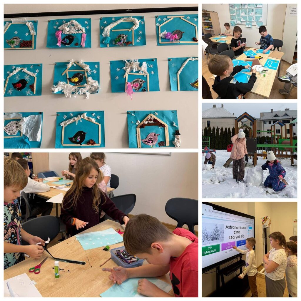 Podczas zajęć poruszono również temat zwierząt zimą. Rozmawiano o sposobach przetrwania zwierząt w okresie zimowym oraz o konieczności niesienia im pomocy. Dzieci wykonały prace plastyczne przedstawiające karmniki dla ptaków.