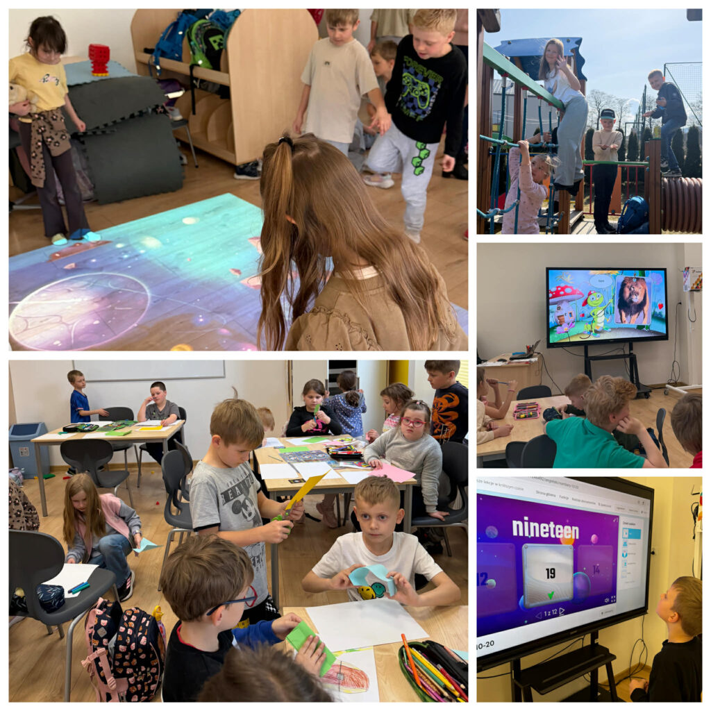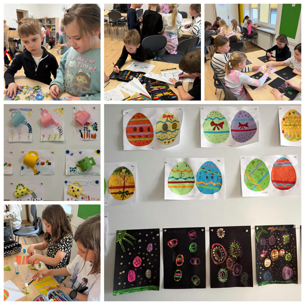 Po powrocie z ferii przywitała nas piękna pogoda ☀️, dlatego chętnie spędzaliśmy czas na świeżym powietrzu, bawiąc się na placu zabaw i rozwijając naszą sprawność ruchową 🏃‍♀️🏃‍♂️ W marcu nie zabrakło też ważnych tematów 💐 Z okazji Dnia Kobiet dzieci przygotowały piękne laurki i drobne upominki 🎁 Następnie powitaliśmy wiosnę 🌷, tworząc kolorowe prace plastyczne pełne radości i kreatywności 🎨 Pod koniec miesiąca skupiliśmy się na Świętach Wielkanocnych 🐣 Dzieci rozwiązywały łamigłówki, a także wykonały przepiękne pisanki 🥚✨ W międzyczasie odbywały się również różnorodne zajęcia rozwijające 📚🎶🇬🇧 – język angielski, zajęcia muzyczne i czytelnicze, które wspierały rozwój kluczowych umiejętności naszych uczniów 🤝💡 To był bardzo aktywny i radosny miesiąc! 😊